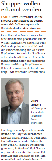 We are quite pleased using Swedish recommendation engine Apptus to enhance the search and shopping experience on smartkauf.de. Implementation into hybris/SAP was easy, and we are seeing some significant impact on the average conversion rate. The tool seems to be quite powerful and we are looking for ways to utilise the technology even more. In a nice little article, German media magazine kontakter touched upon the topic – see a cut-out below: